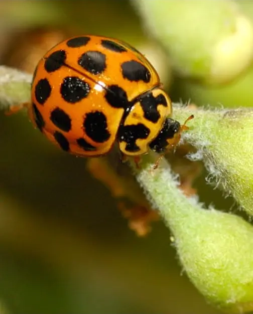 There are four common garden species of ladybird in Australia. The common spotted ladybird is bright orange with black dots on its back. They're voracious predators of aphids, scale insects and mites. Adults will consume 2,500 aphids during their life.